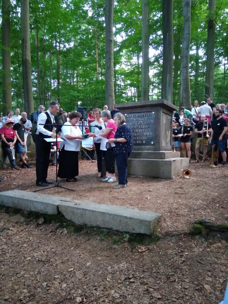 17.6.2022 jsme se v počtu 8 členů našeho sboru účastnili oslav 300 let od založení města Ochranova. Účast při zahájení oslav byla obrovská. Velké štěstí pro nás byla ses. Beninga Carstens, která se nám věnovala. Prohlédli jsme si ještě prázdný, až na detaily obnovený , zcela bílý velký sál, ses. Benigna nás seznámila s jeho historií. Prohlédli jsme si další prostory, vystavený materiál. Potom jsme se vydali na nedaleký starý hřbitov. Účastnili jsme se oficiálního zahájení už v plném velkém sále. Hudbou doprovázely varhany a kvartet safoxonů. Vlastní zahájení a srdečné přivítáni proběhlo venku u zbytku původní zdi se zvonem. Přivítal nás všechny farář Peter Vogt s manželkou Jill. Doprovázeli známí trubači. Společně jsme si zazpívali. V podvečer jsme se všichni, s trubači v čele a na konci velkého zástupu, vydali pěšky na místo, kde byl poražen první strom při založení Ochranova. Je to místo na pozemku věnovaném hrabětem Zinzendorfem emigrantům z Čech. A tady začíná Obnovená Jednota bratrská. Za nás vystoupila s pozdravem ses. Jana Uhlířová a s kurátorkou ses. Marcelou Pallovou předaly dar, skleněný bílý krystal s rytinou beránka a datem výročí.